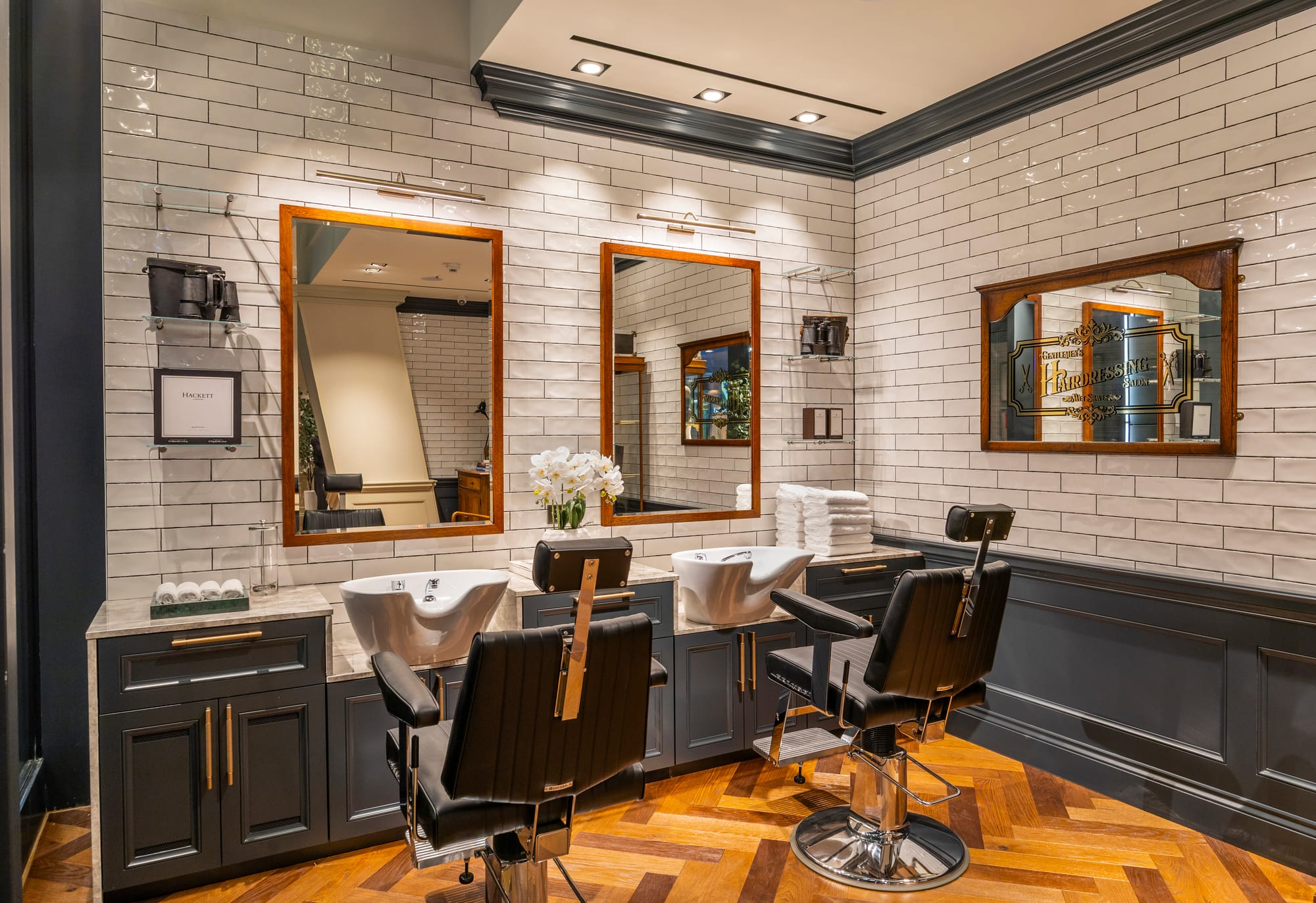 Die Neuerung steht hinten im Raum. Frankfurt ist der erste deutsche Hackett-Standort mit hauseigenem Barbier; bisher gab es den Service nur in London. Wer den Anzug abholt, kann sich anschließend rasieren lassen.