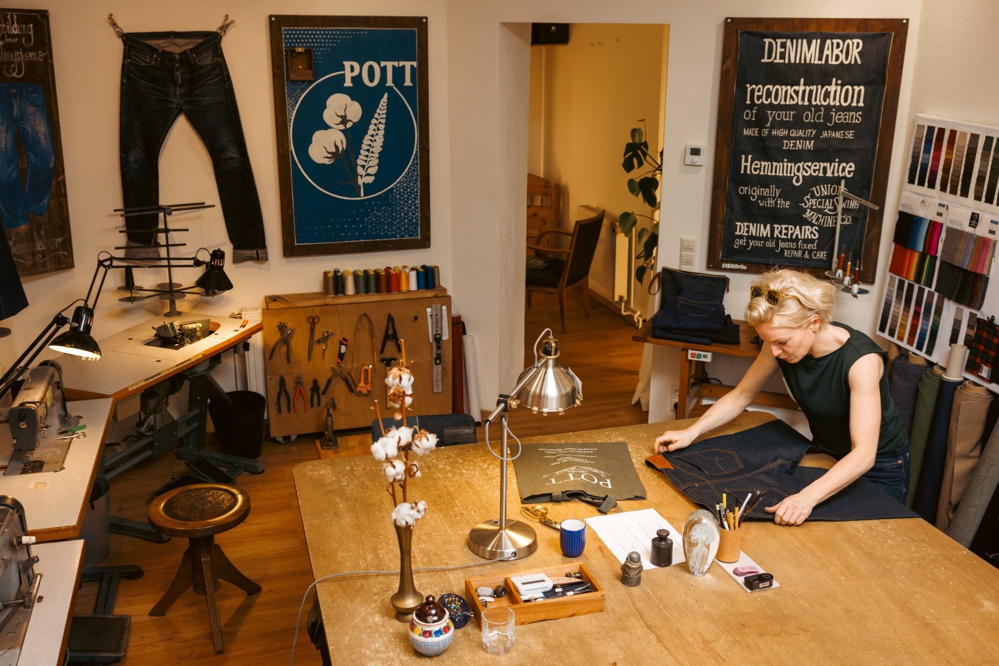 Seit über zehn Jahren fertigt Manuela Pott in ihrer Werkstatt POTT manu’facture maßgeschneiderte Jeans. Kunden lassen sich vor Ort vermessen oder schicken eine alte, geliebte Jeans mit der Post nach Berlin, die kein Label mehr verkauft. Pott nimmt den Schnitt ab, wählt den Stoff und liefert in etwa vierzehn Tagen eine neue Hose, die der alten ähnelt wie ein Bruder, nur ohne die Löcher.