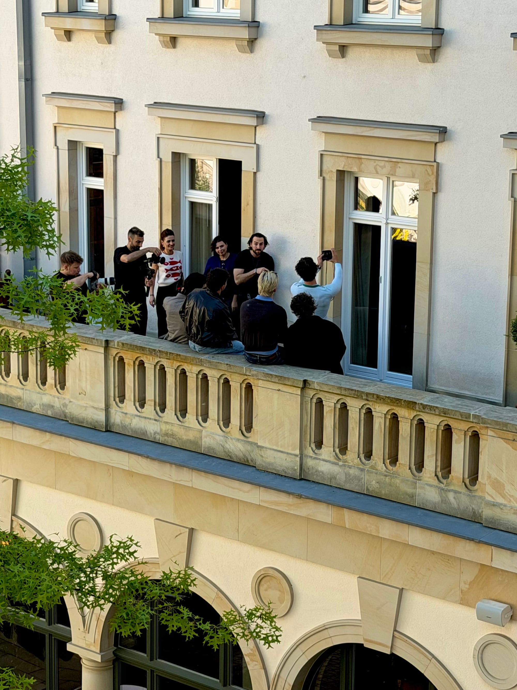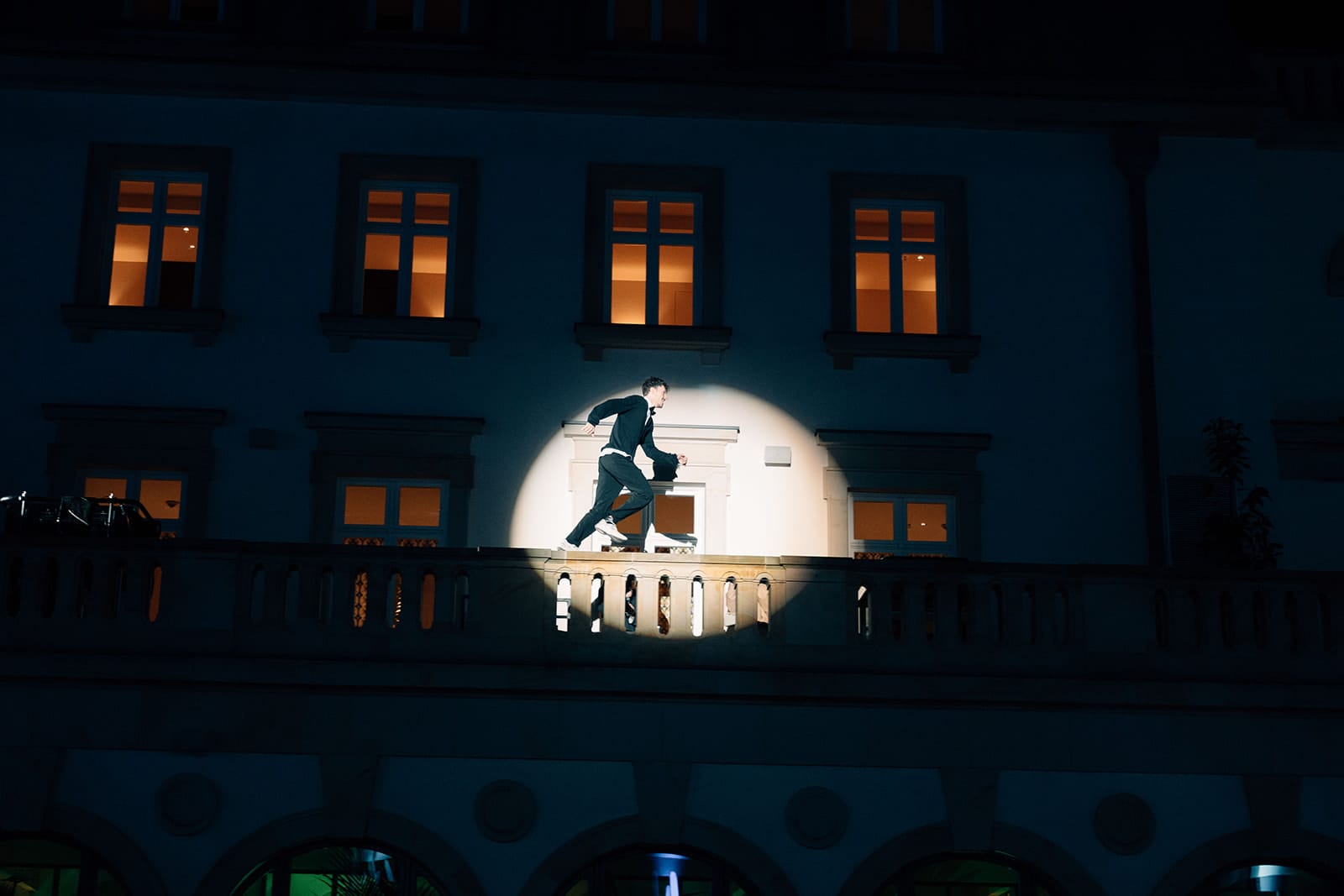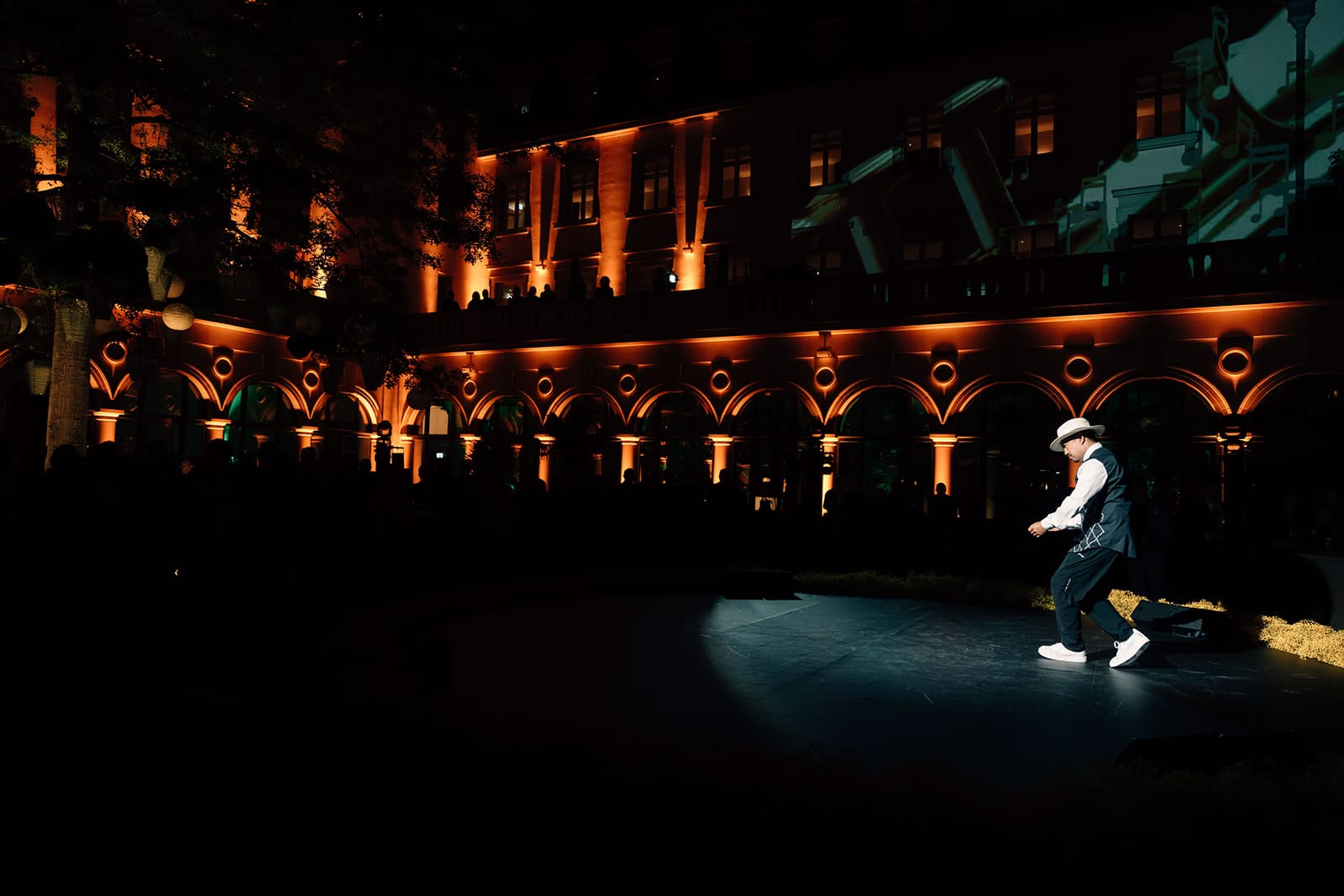 Mitten im Abend dann ein unerwartetes Bild: Einer der Flying Steps springt mit einem Salto zwischen die Fassaden des Innenhofs, hängt für einen Augenblick in der Luft, und dreihundert Köpfe drehen sich gleichzeitig nach oben.