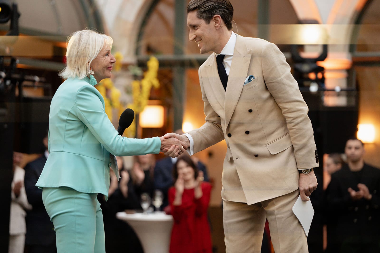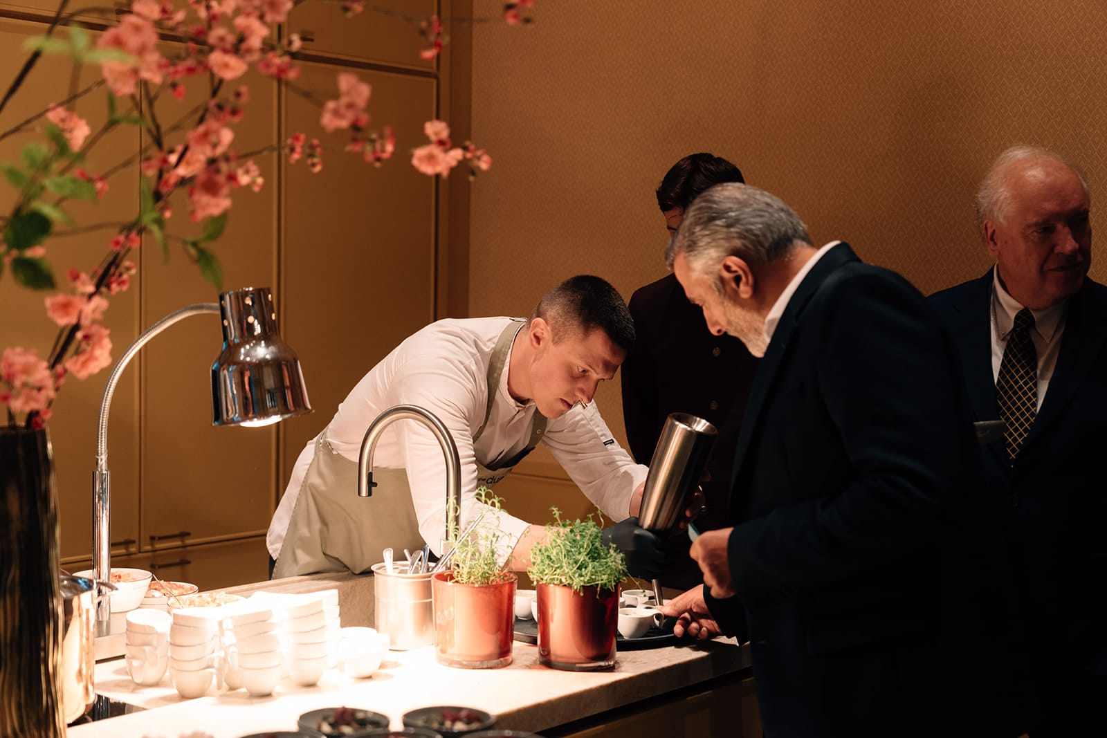 Wir sitzen am Nachmittag vor der Eröffnung in einem der Salons. Frank Marrenbach, CEO der Althoff Hotels, erzählt; Boris lehnt sich leicht nach vorn, wie jemand, der weiß, was als Nächstes kommt. Es ist die Geschichte mit der Olive.