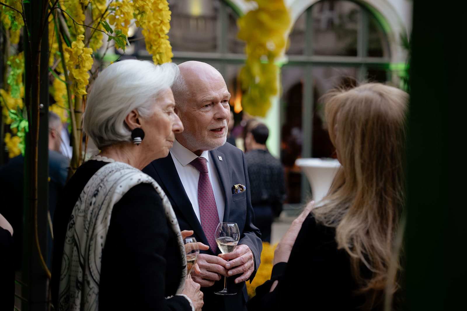 Vier Momente eines Abends: Christine Lagarde mit Thomas Althoff, dem Gründer der Althoff Collection. Digitalministerin Kristina Sinemus im Handschlag mit Boris Messmer. Der General Manager und Frank Marrenbach auf der Bühne