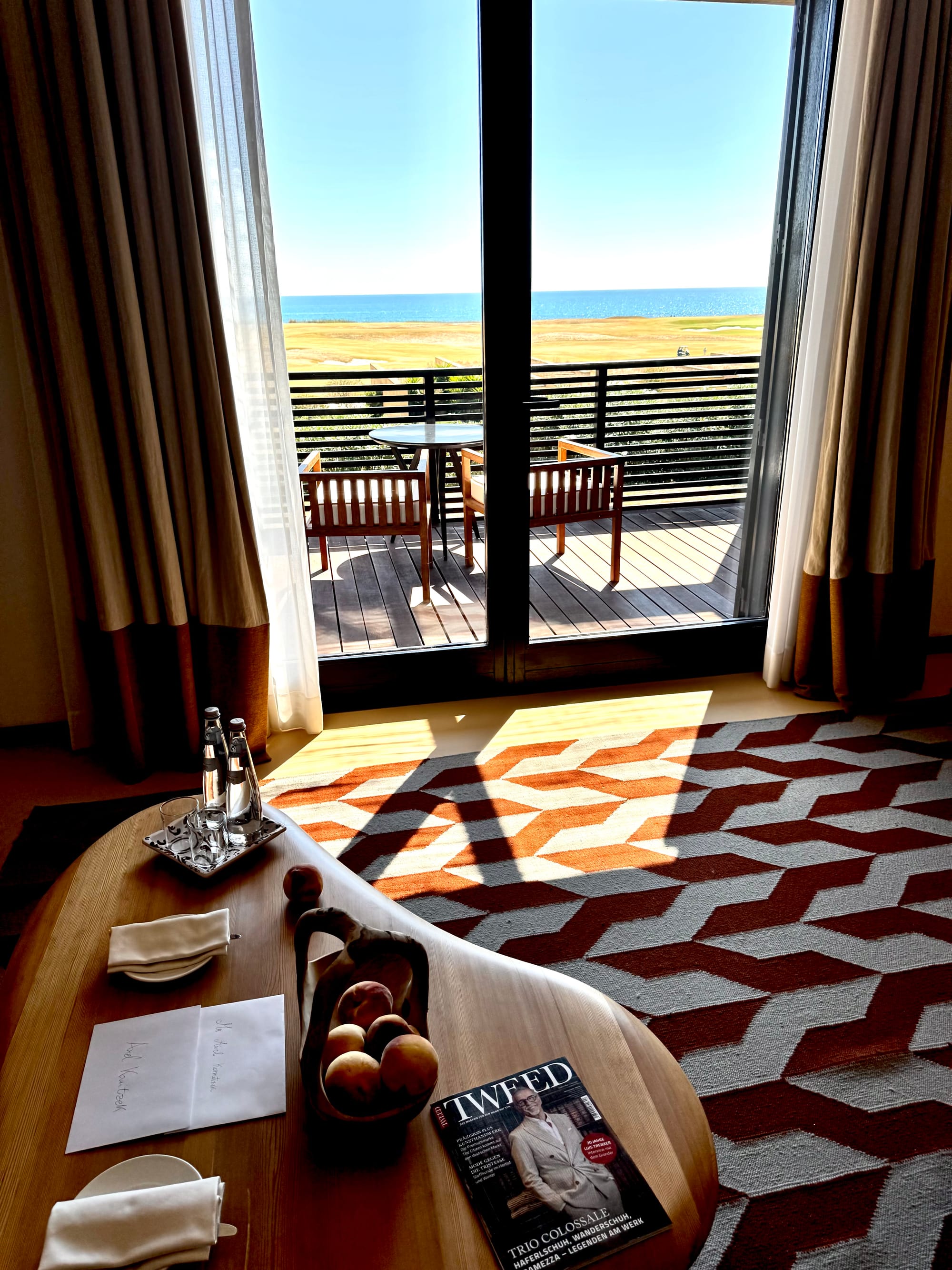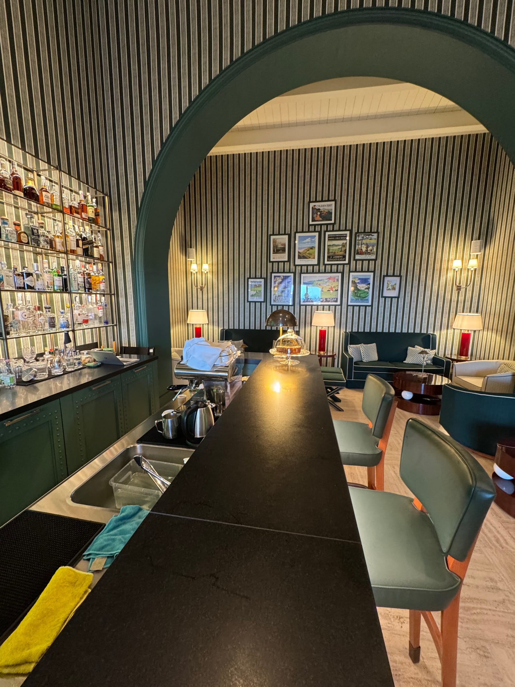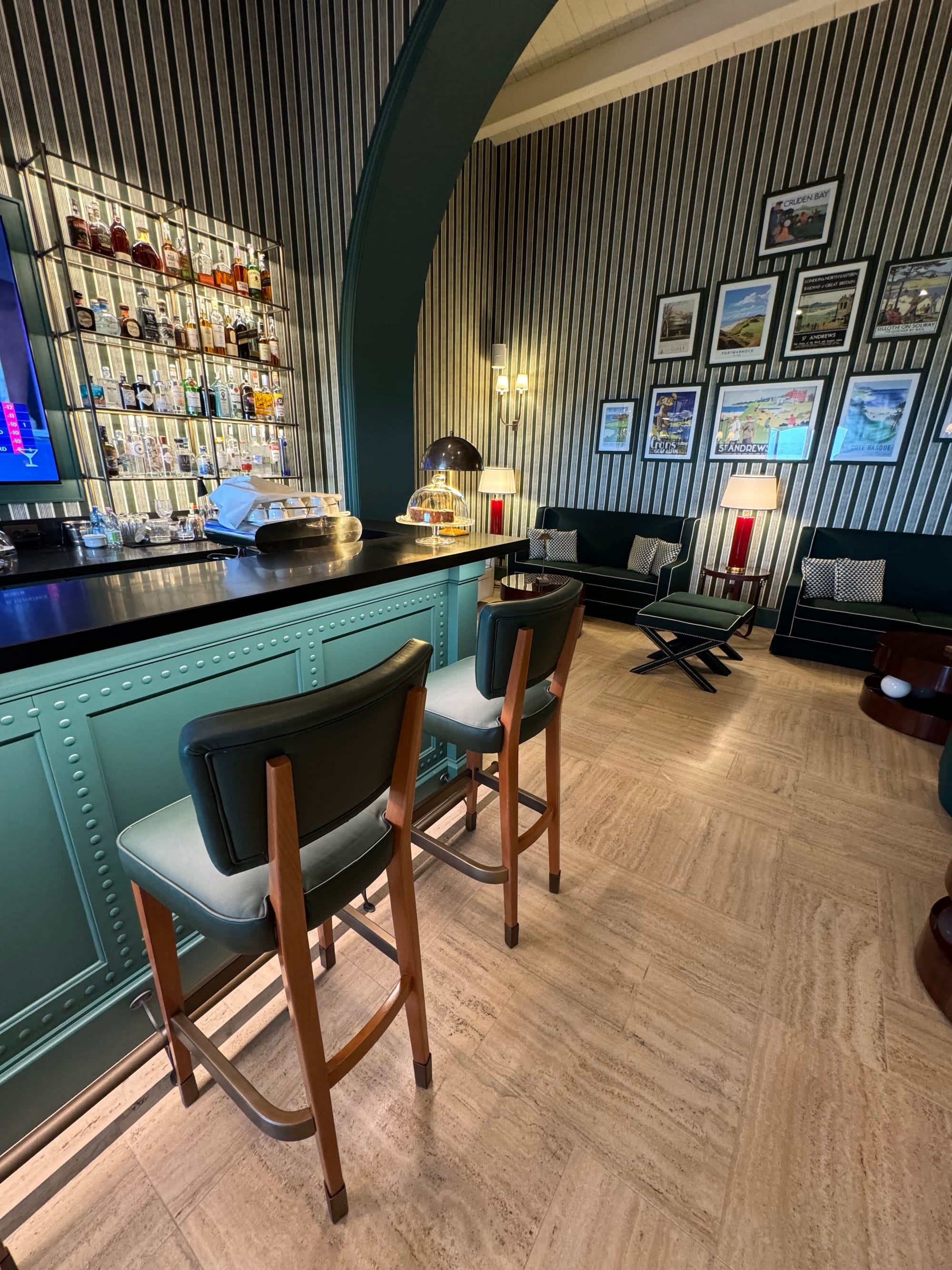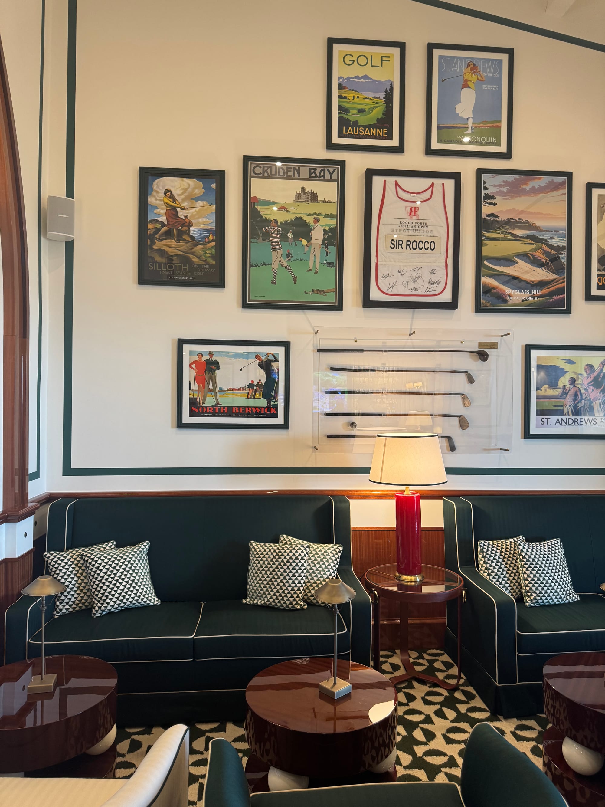 Das Clubhaus zwischen den beiden Golfplätzen, im Sommer 2025 von Paolo Moschino und Philip Vergeylen eröffnet, sieht aus wie das Set eines amerikanischen College-Films: dunkles Eichenholz, Mosaikböden, tiefgrüne Lederfauteuils. Für vier Stunden auf dem Fairway hatte ich keine Zeit; ein Marsala am achtzehnten Loch hingegen schon.