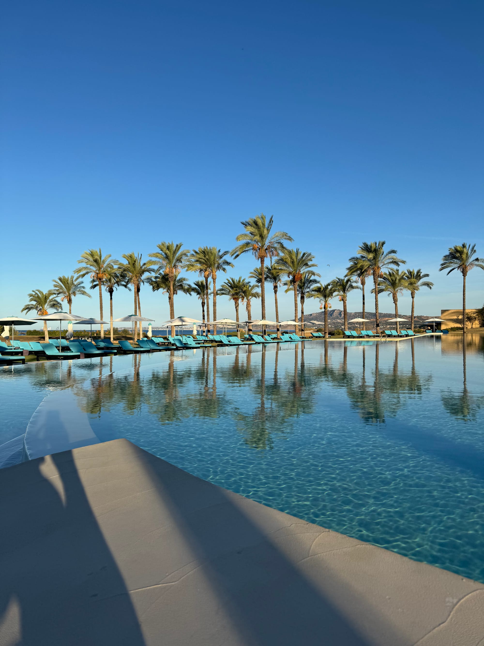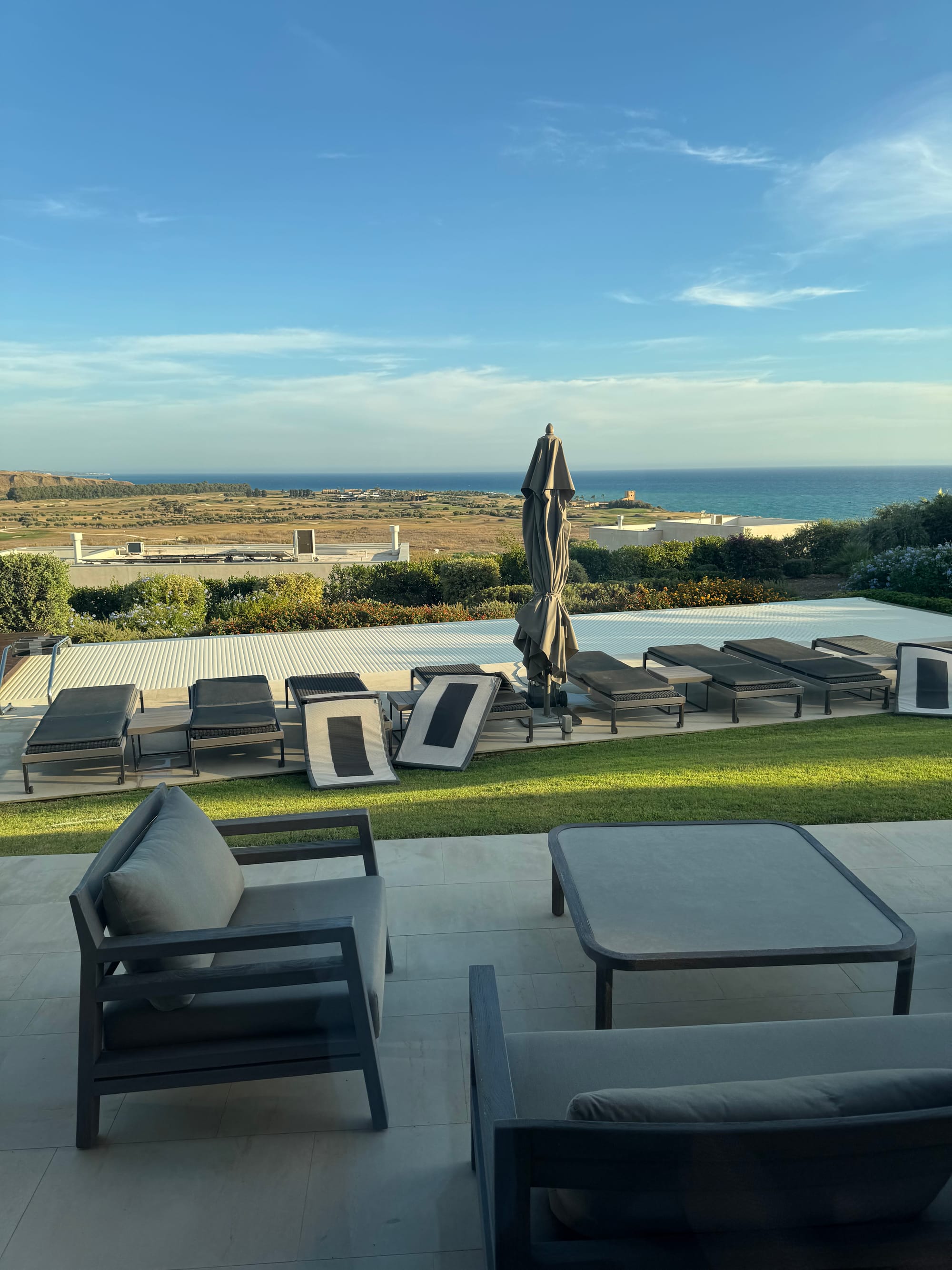Zweiundzwanzig Kilometer Serpentinen führen ins Tal. Das Land, auf dem das Verdura Resort steht, gehörte einst den Herzögen gleichen Namens; mit Fulco di Verdura, Schmuckdesigner Coco Chanels und Vetter Lampedusas, starb das Geschlecht 1978 aus. Sir Rocco Forte hat es in den frühen Zweitausendern von siebzig Eigentümern zurückgekauft. Heute verteilen sich 203 Zimmer auf 230 Hektar in zwei Steinriegeln aus Beton, Terrakotta und Sand, errichtet vom Venezianer Flavio Albanese; die Innengestaltung von Olga Polizzi, auf jedem Nachttisch eine Ausgabe des „Leoparden”. Wer den eigentlichen Luxus sucht, geht hinauf: Oberhalb der Hotelriegel liegen zwanzig Privatvillen, jede mit eigenem Pool, eigenem Garten, eigenem Buggy.